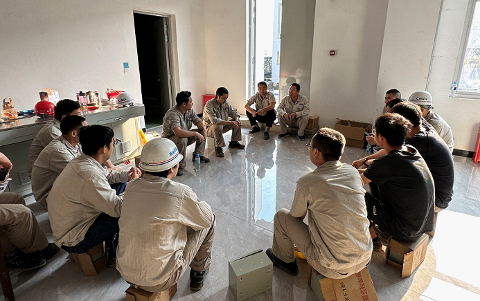 每日晨會在簡陋的辦公室定時召開。常務項目副經理、黨員董立蘇逐個落實重點事項,對每日繁雜的工作任務進行簡單梳理,確保急難險重問題能快速解決。