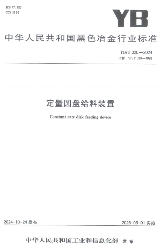 公司主導(dǎo)修訂的《YB/T 020-2024 定量圓盤給料裝置》行業(yè)標(biāo)準(zhǔn)正式發(fā)布